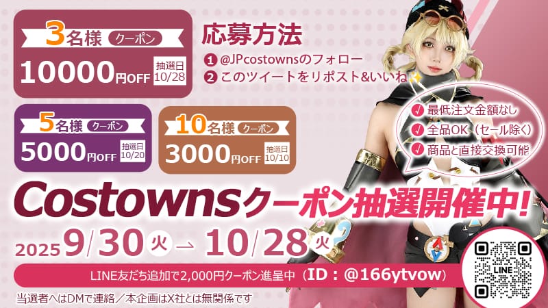 ▶ https://t.co/5gi2dCUIKV</a >#コスプレ</a > #プレゼント企画</a > #抽選</a > pic.twitter.com/UaqYkQOLzn</a ></p >— Costownsコスプレ衣装通販専門店【公式】 (@JPcostowns) September 30, 2025</a >